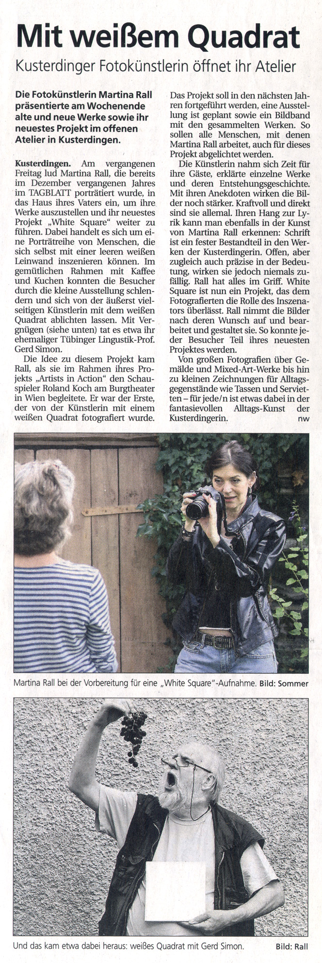 Roland Koch Actor. Artist Portraits. Photography Book Hard- and Softcover, 88 pages, 59 portraits. http://www.blurb.de/b/5663661-roland-koch-schauspieler Roland Koch. Burgtheater. Culture magazine APP - art.photography.poetry Softcover, 92 pages, 64 portraits. http://www.blurb.de/b/6256814-roland-koch-burgtheater "Artists in Action" Photoblog: http://martinarallphotography.blogspot.de/ Photo Representation: APA PictureDesk, Vienna, Austria Press "Der Künstler in seinem Element" Artist & Photographer Martina Rall by Ulrike Pfeil Schwäbisches Tagblatt, 27.12.2014 Schwäbisches Tagblatt, 08.09.2015